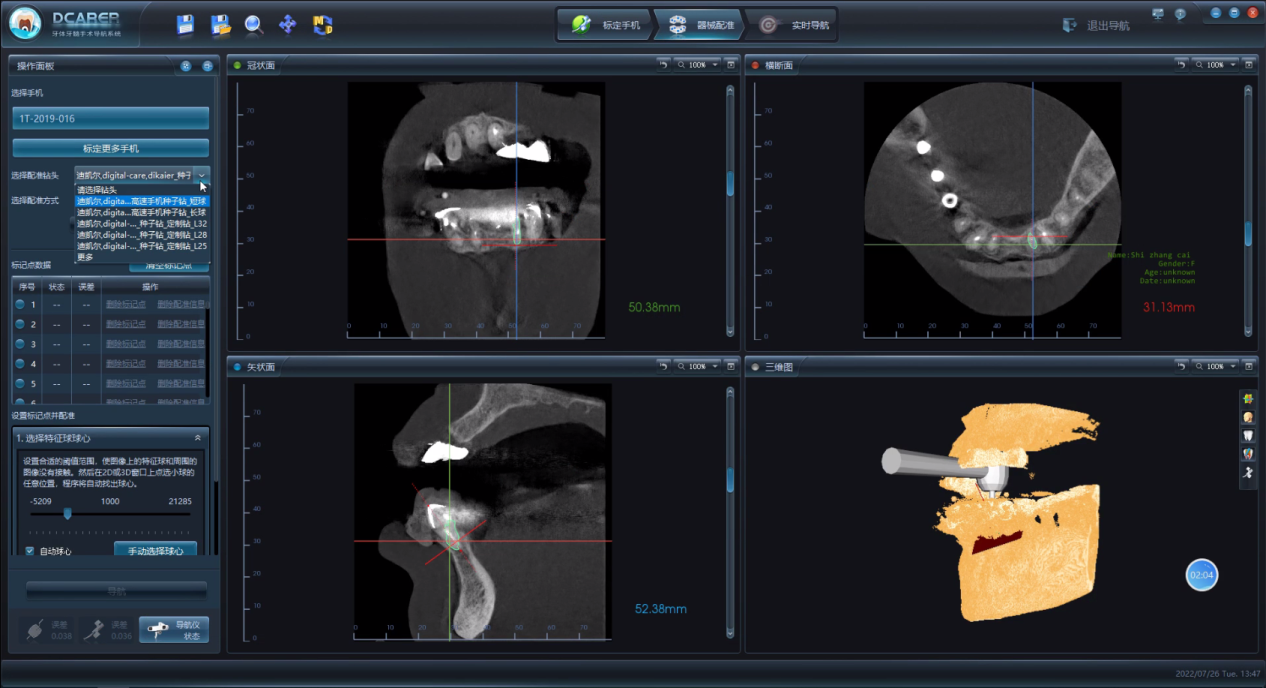 在術(shù)中,董茜茜副主任團隊通過動態(tài)導(dǎo)航軟件輔助設(shè)計下頜四顆牙根尖的三維位置,并成功在9分鐘內(nèi)完成四顆牙的根尖切除術(shù)。通過術(shù)前、術(shù)后CBCT對比驗證,四顆牙根尖的切除誤差均小于0.06mm。