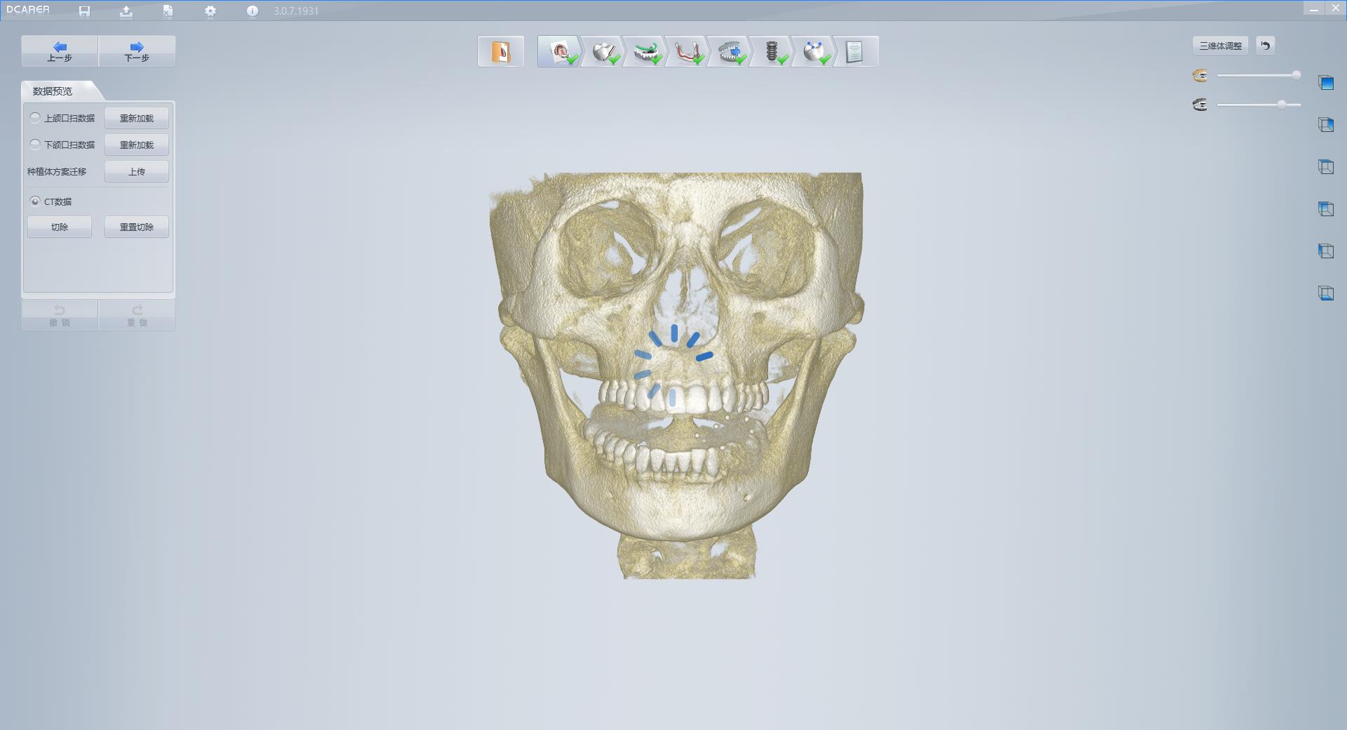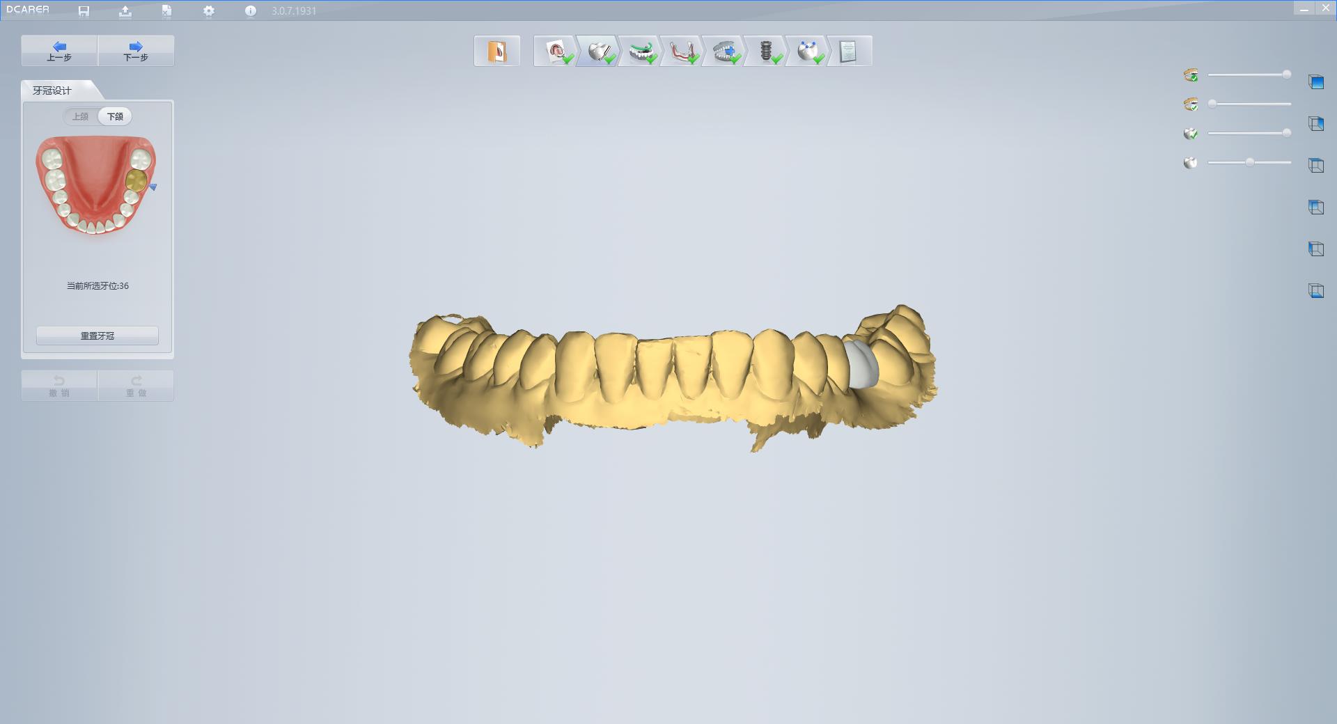 根據(jù)醫(yī)生使用習(xí)性,新增鼠標(biāo)交互功能、可使用鼠標(biāo)完成模型的放大縮小及拖曳,還可進(jìn)行三維模型的自由旋轉(zhuǎn),全方位查看種植設(shè)計方案(植體、牙冠的擺放、上下頜咬合關(guān)系);
